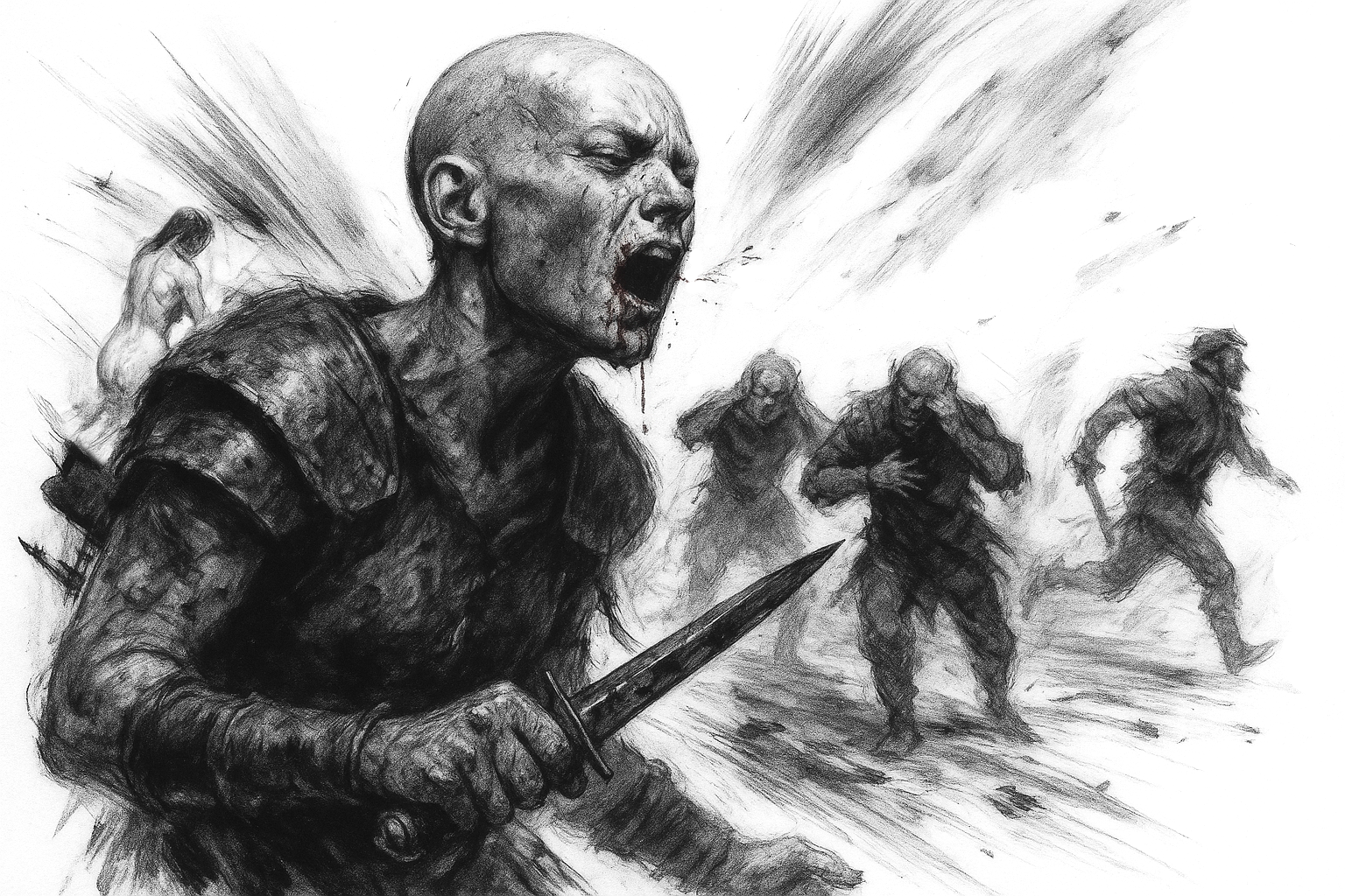 Am dritten Tag sah sie Rauch – kein Herdfeuer, kein Dorf, sondern Plünderer. Die Art, die nach dem Krieg kommt wie Robben, wenn das Eis knackt. Drei Männer standen dort. Zwei Jungen lagen am Boden. Eine nacke Frau war, ihr Kleid von den Männern beiseite geworfen, kniete voller Furcht. Lethiras Stimme war noch rau, aber sie sang. Nur einen Ton, tief und klar wie Eisen auf Eisen, begleitet vom Blut, das ihrer geschundenen Kehle entströmte.