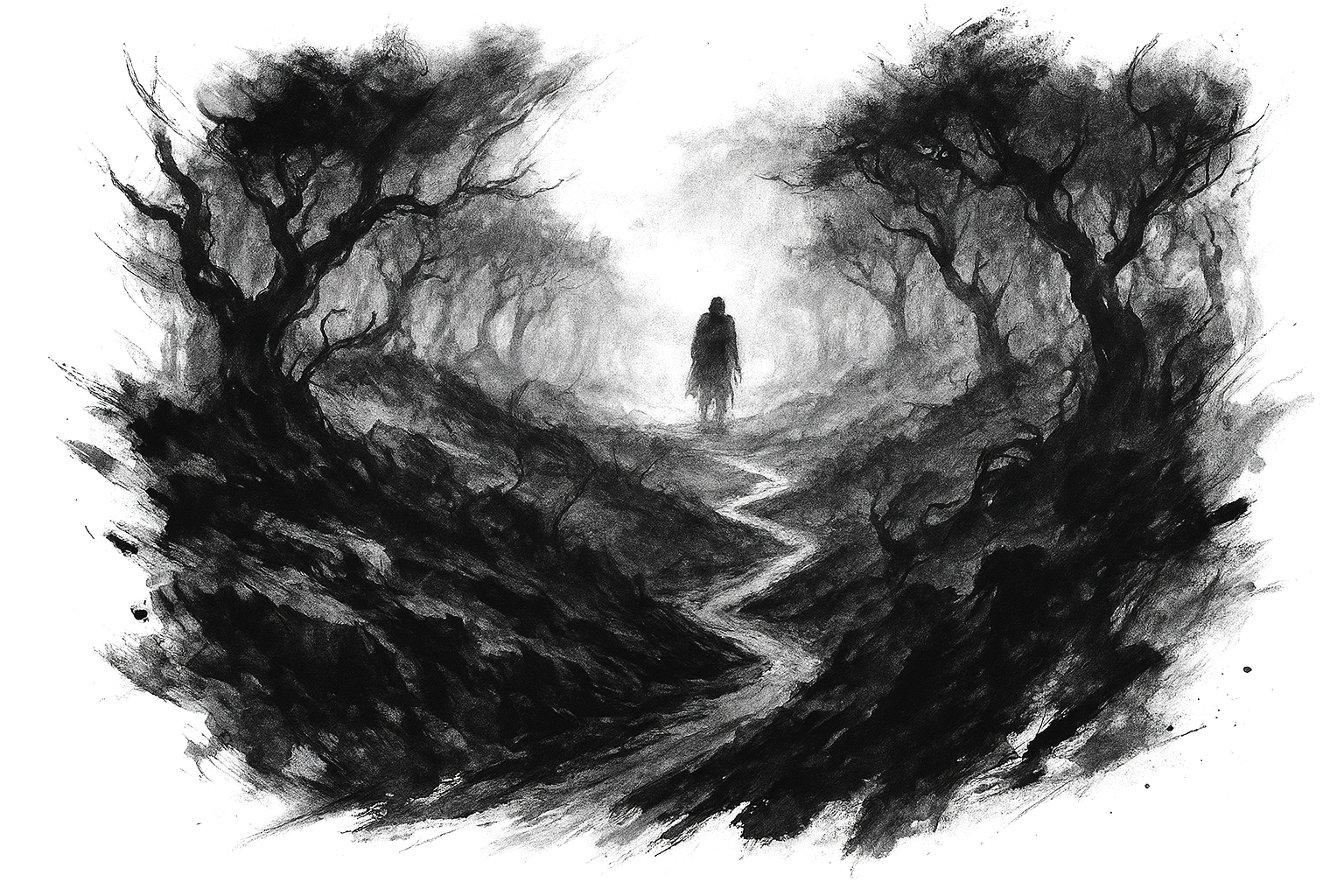 Entlang des Pfades, der sich durch dichtes Unterholz schlängelte fand Lethira die erste Prüfung. Es war ein alter Mann mit leerem Blick, der ihr entgegentrat, während Asche in kleinen Wirbeln um ihn fiel. Seine Stimme war dunkel, schmal und kaum zu hören: