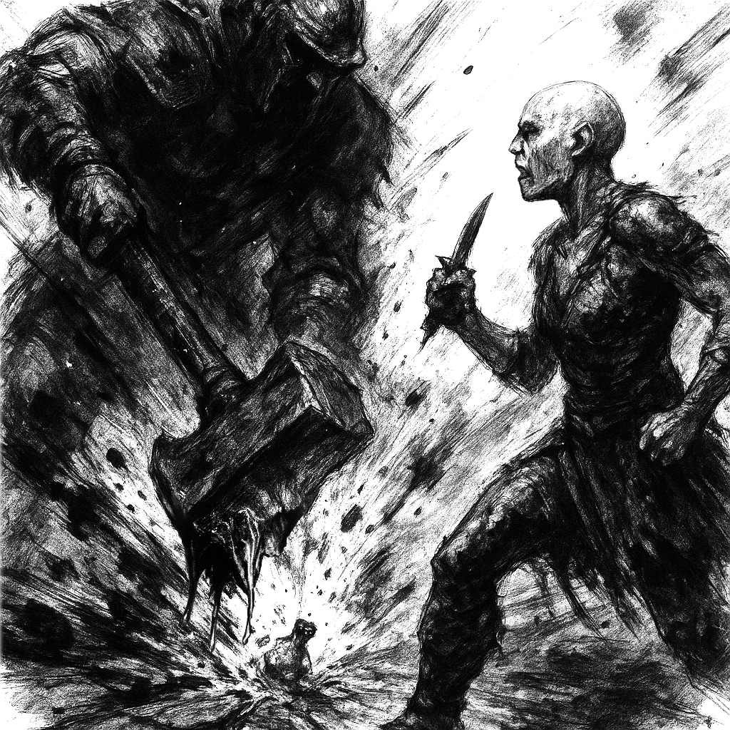 Der fünfte Wächter war ein Hüne mit einem Hammer, der größer war als Lethira selbst. Seine Haut war grau von Staub und getrocknetem Blut, seine Augen wie verbranntes Holz. Er sprach kein Wort und stelle keine Frage. Nur der Hammer sprach – laut und tödlich. Sie sprang beiseite und der Boden riss auf, der Stein spritzte wie Wasser. Der zweite Hieb streifte ihre Schulter, riss Fleisch und Stoff auf und fegte nach ihr einen alten Baum wie eine Blume aus dem Weg. Der dritte Hieb kam von oben, sie rollte unter ihm hinweg. Ihre Finger zitterten, doch sie zwang sie zur Ruhe. Als der Hüne zum nächsten Hieb ausholte, wich sie nicht, sondern warf ihm den Trank vor die Füße. Sein Hammer zerschellte das Glas – und der Hammerkopf schmolz wie heißes Wachs. In seiner Verwirrung stieß Lethira ihm den Dolch ins Herz.