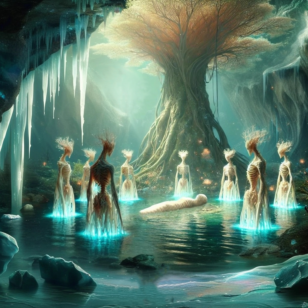 Irgendwo im Reich der Rash’Nu, tief unter der gefrorenen Haut der Welt, wo das Eis in jadegrünen Lichtadern schimmert und der Atem zu Kristallen gefriert, öffnet sich eine gewaltige Gletscherspalte. In ihrem Schoß liegt ein Heiligtum der Rash’Nu: ein gewundener Gang aus glatt geschliffenem Kalk, der sich in die Tiefe schlängelt, bis er sich in eine kreisrunde Kammer öffnet – einem der Nährbrunnen, jene tiefen, mit mineralhaltigem Schleim gefüllten Becken, in denen die Körper Verstorbener aufgelöst und in ihre Grundessenzen zurückgeführt werden. In dieser zersetzenden Wiedergeburt wird nichts vergeudet: Körper, Wissen und Erfahrung fließen zurück ins Schwarmbewusstsein – aber nur durch die Hand der Yth’Shaar. Diese ehrwürdige Kaste von Rash’Nu verzichten bewusst auf die ständige Verbindung zum Schwarm, um das geistige Echo der Toten nicht zu überlagern.