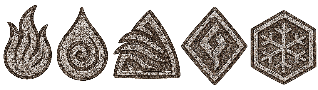 Bevor die Gilden Götter und Ordnung brachten, ehrten unsere Vorfahren die Urkräfte der Natur. Feuer, Wasser, Luft, Stein und Eis wurden als Mächte verehrt, die unser Schicksal bestimmten. Diese Traditionen, so sagt man, stammen aus Tagen, als der Mensch noch kaum mehr war als ein Wilder, der in Höhlen lebte.